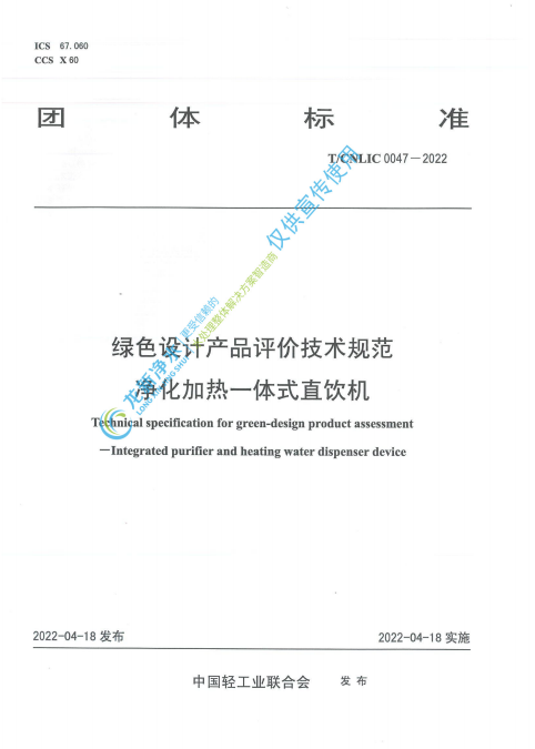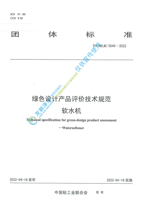 近日,由湖南龍新凈水科技有限公司參編的《綠色設計產品評價技術規范凈化加熱一體式直飲機T/CNLIC0047-2022》、《綠色設計產品評價技術規范軟水機T/CNLIC0046-2022》,經由中國輕工業聯合會發布,被部委采信。