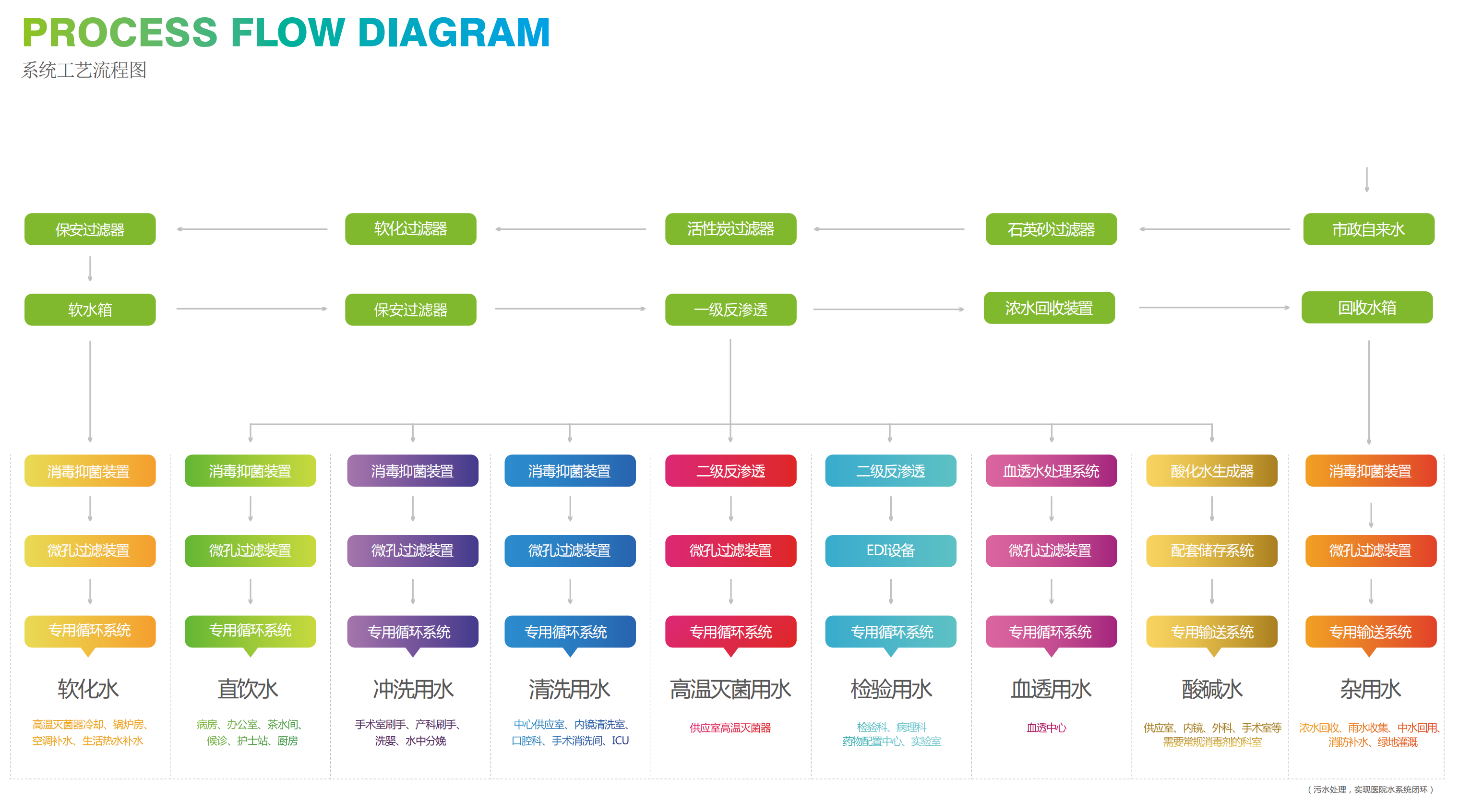 水資源是人類生存和社會發展必不可少的重要資源。隨著社會經濟的迅速發展,水資源的重要性越來越凸顯,醫院作為服務型公共機構,水處理技術與水處理設備的選擇及使用是建設資源節約型、環保友好型醫院的主要途徑。醫院通過前期的水量設計與水質設計,明確院內各醫療單元水系統主要工藝設備及選型配置,為后期醫院智能化、綠色節能運維提供基礎。