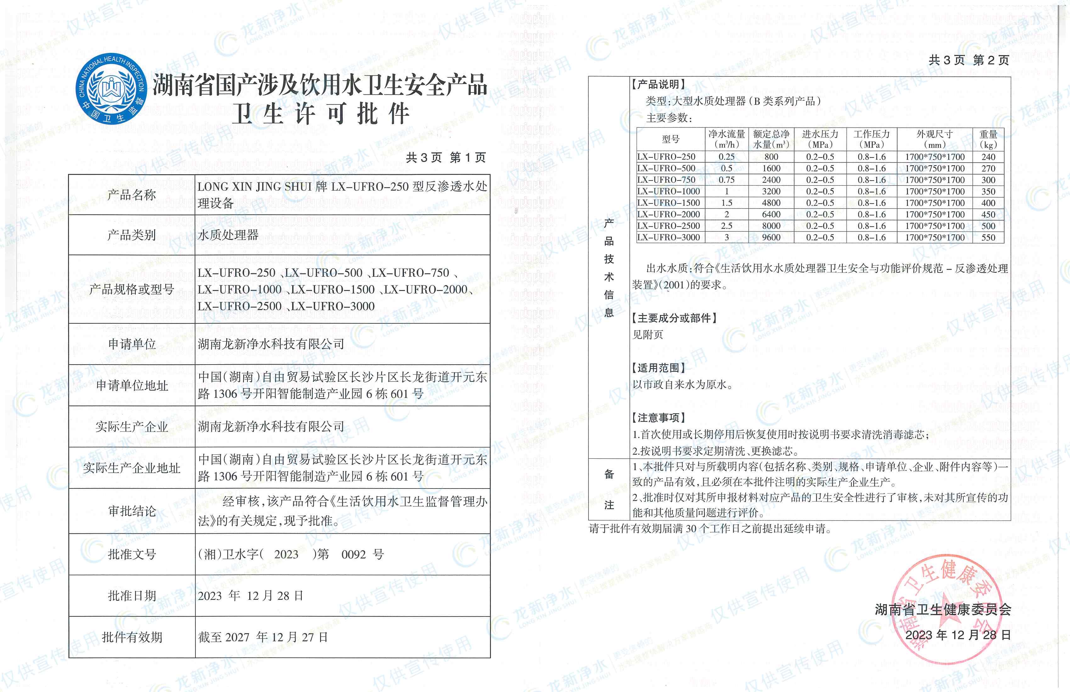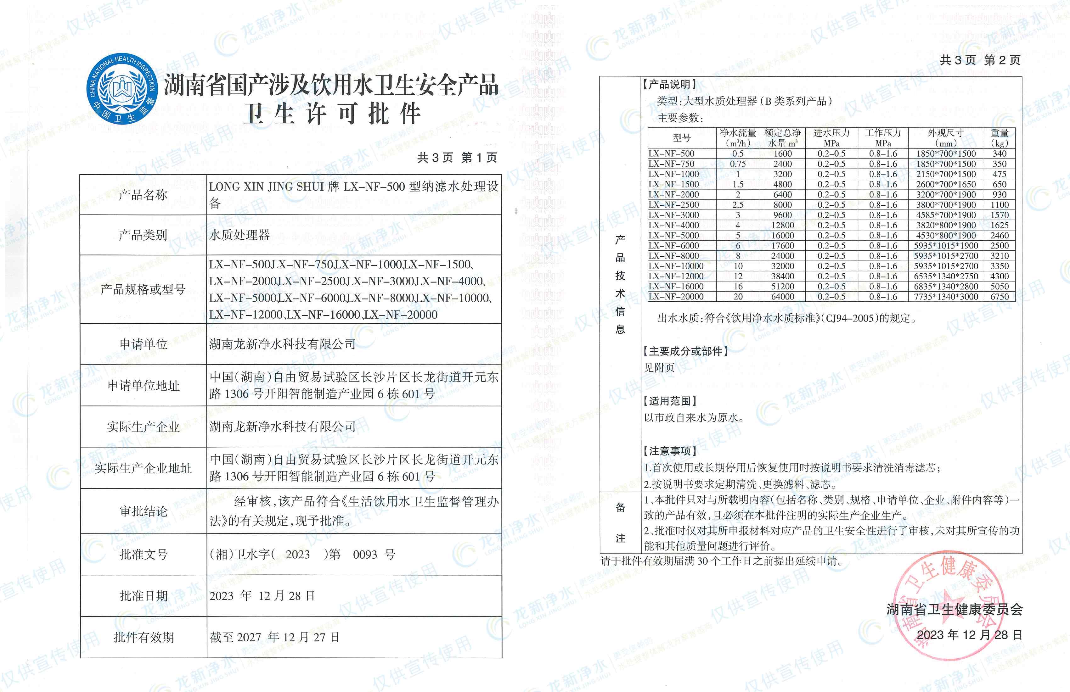 近日,我司反滲透水處理設備與納濾水處理設備取得了涉水衛生安全產品衛生許可批件,與其同時,還獲得了由湖南省住房和城鄉建設廳證書頒發的建筑施工企業安全生產考核合格證書。