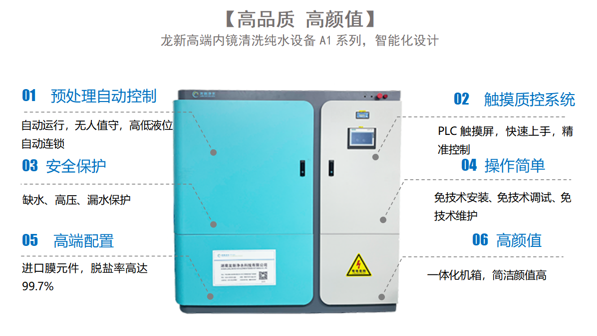 內鏡清洗純水設備A1系列原水水質是市政自來水、水質指標符合GB/5749生活飲用水衛生標準;產水電導率<15us/cm,水質符合《軟式內鏡清洗消毒技術規范》WS507-2016用水指標軟式內鏡清洗消毒細菌總數≤ 10 CFU/100 mL,濾膜孔徑(定期更換)≤ 0.2 μm。